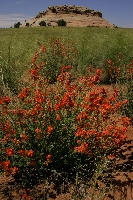 Desert Paintbrush Canyonlands National Park, Utah A Giant Red Indian Paintbrush grows in the grasslands of the district known as Island of the Sky, atop a huge mesa that drops thousands of feet to dozens of deep canyons. This Paintbrush sends its roots toward those of other plants, robbing them of their nutrients. In the distance is a formation of heavily-eroded rock. |